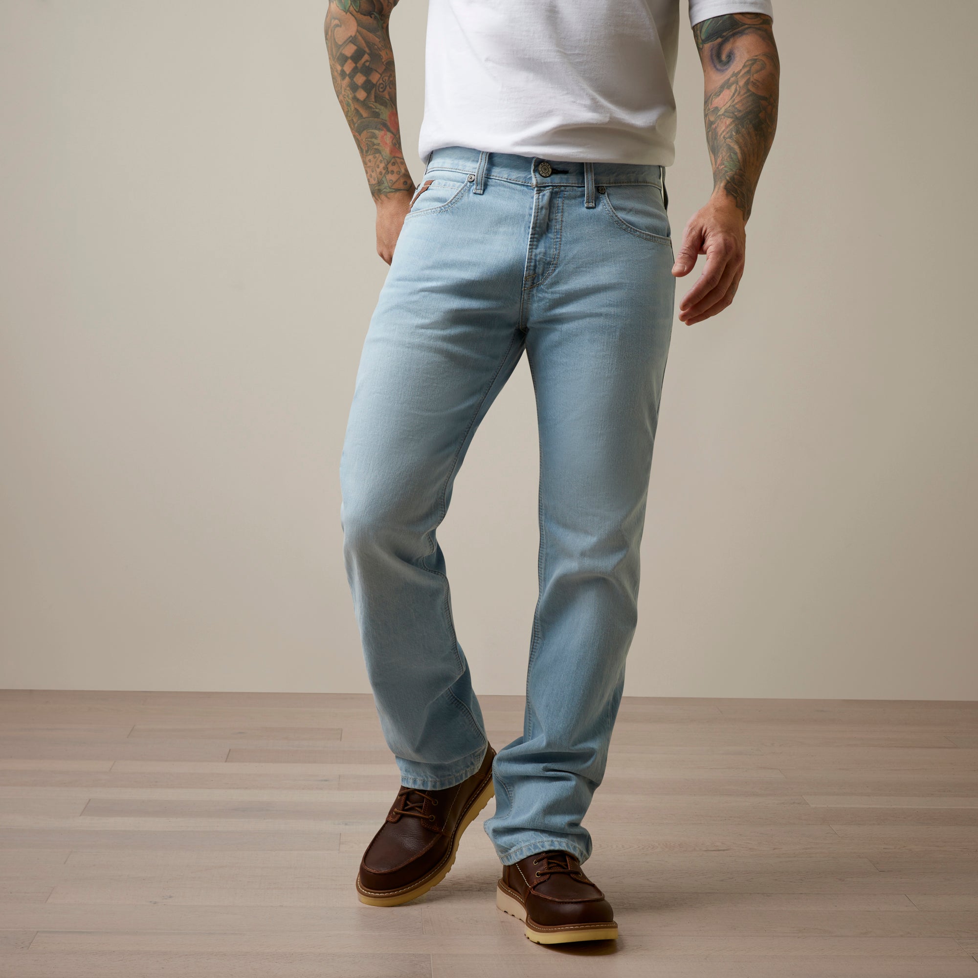 Western sensibility meets rocker edge. Standout in stylish denim artfully faded for a best-of-both-worlds look and a slim, stackable straight leg opening.