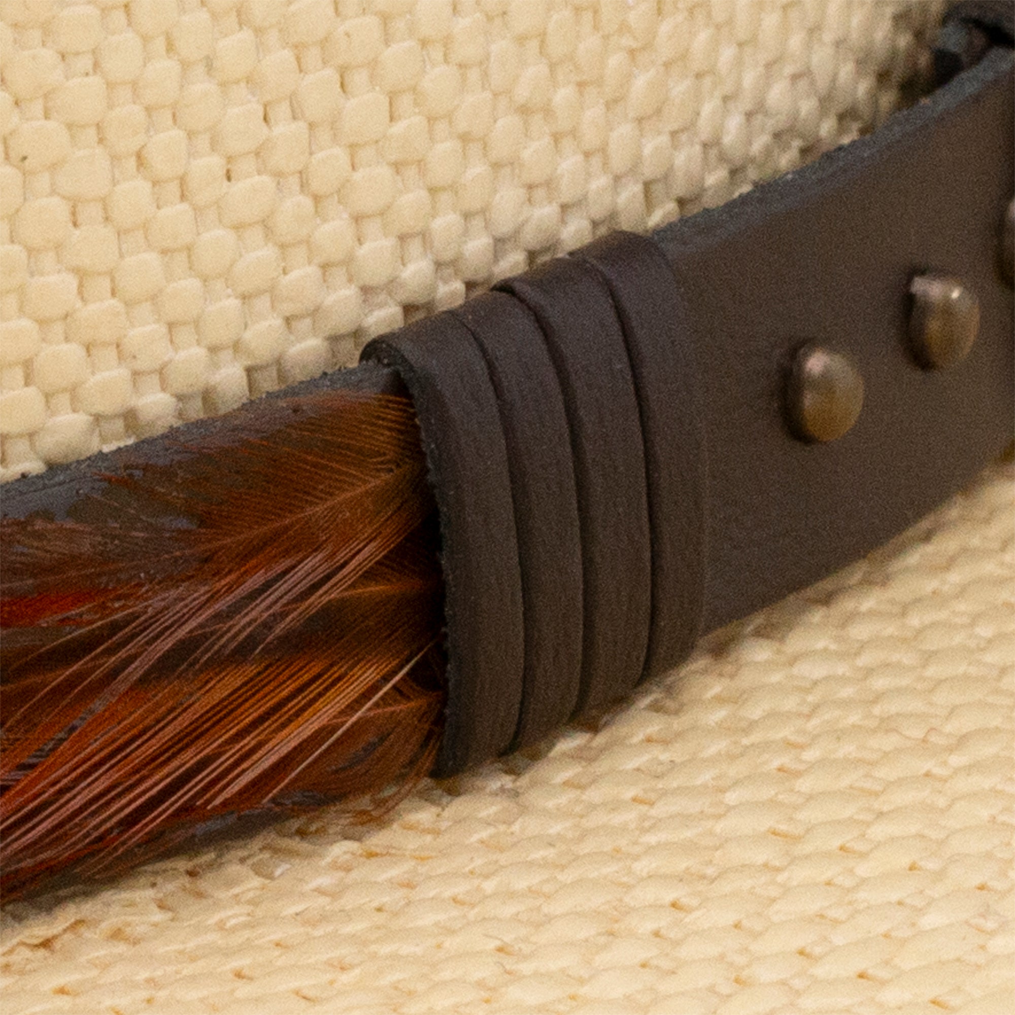 • Leather hat band with feather accent