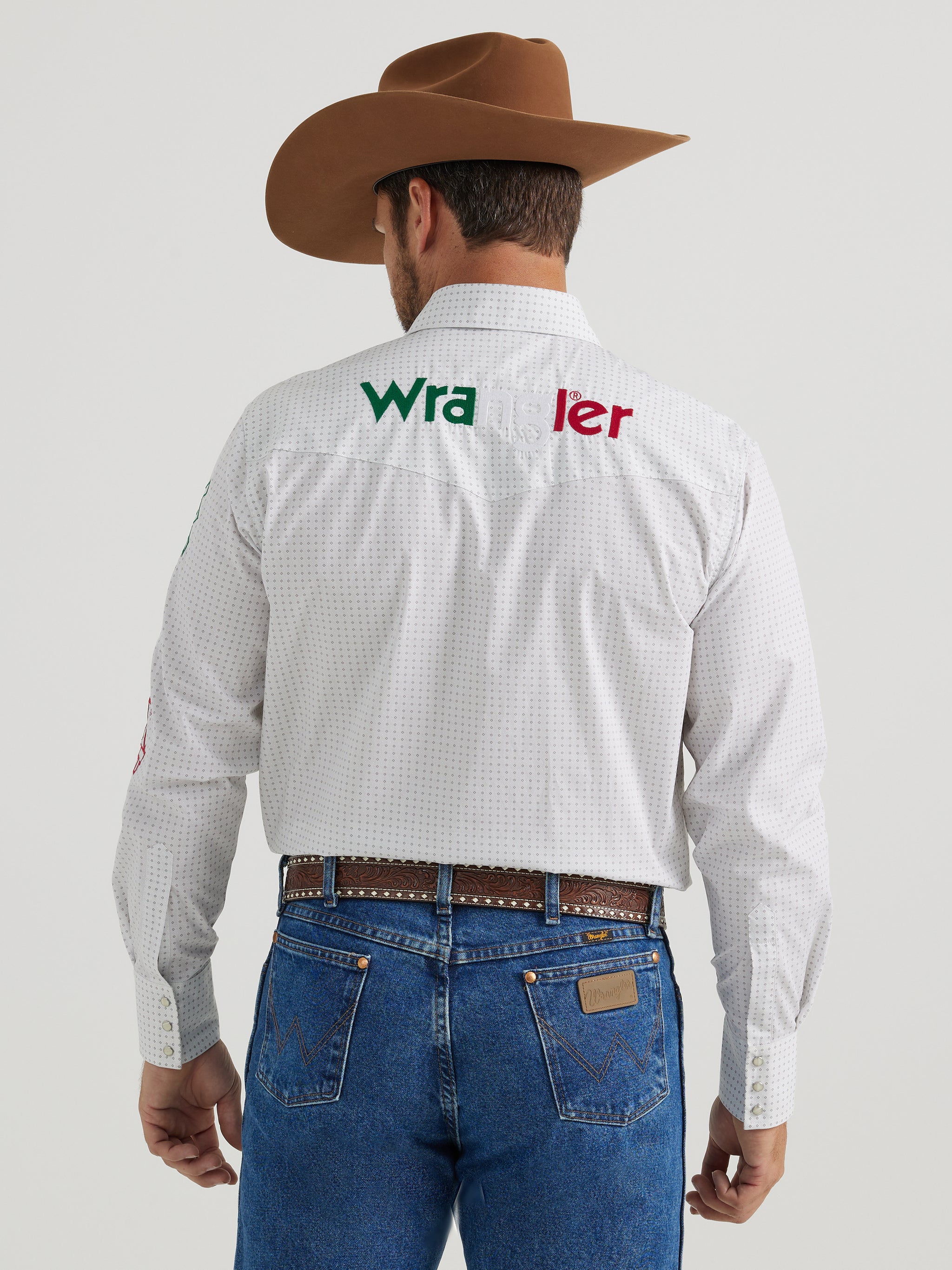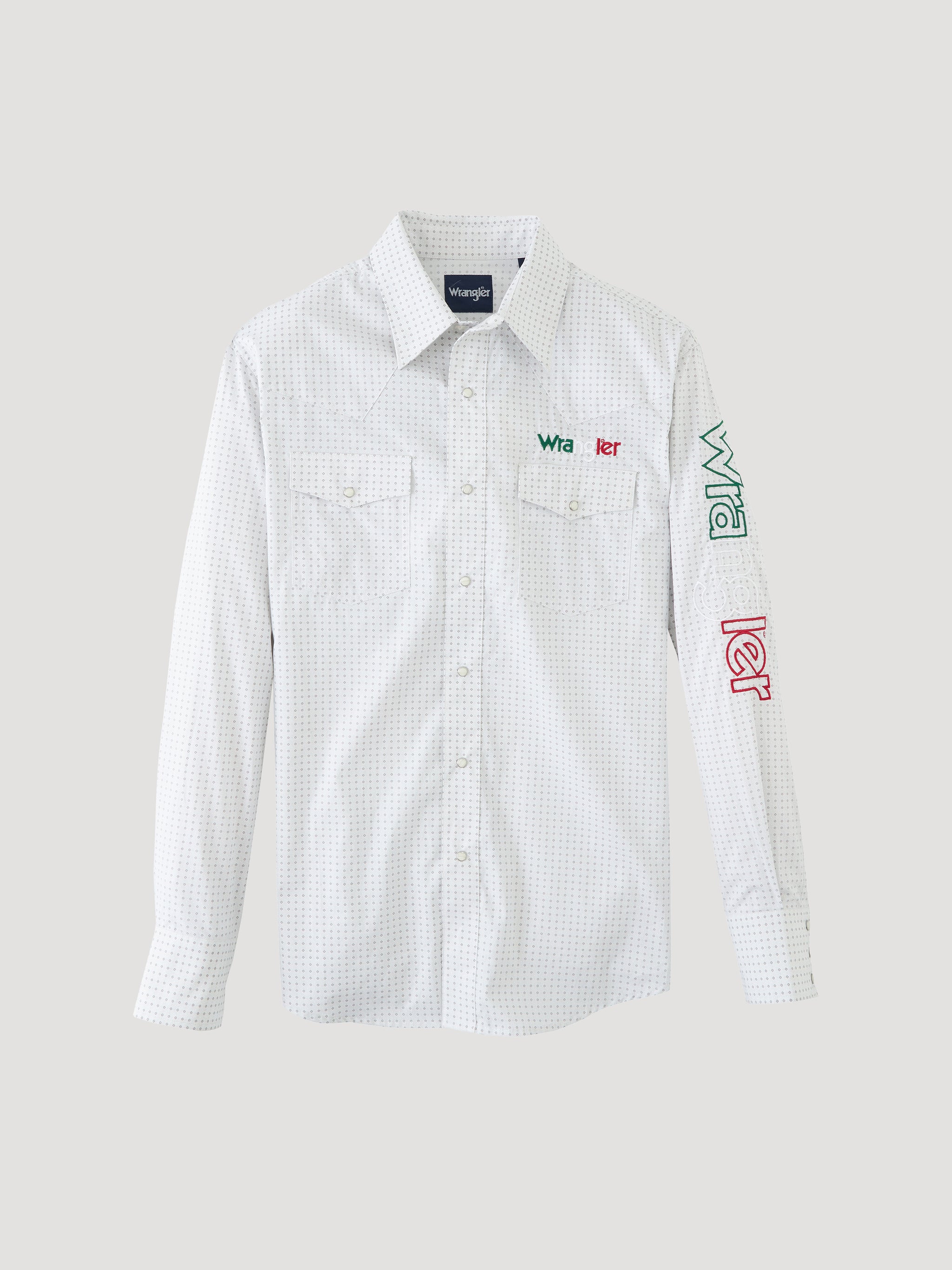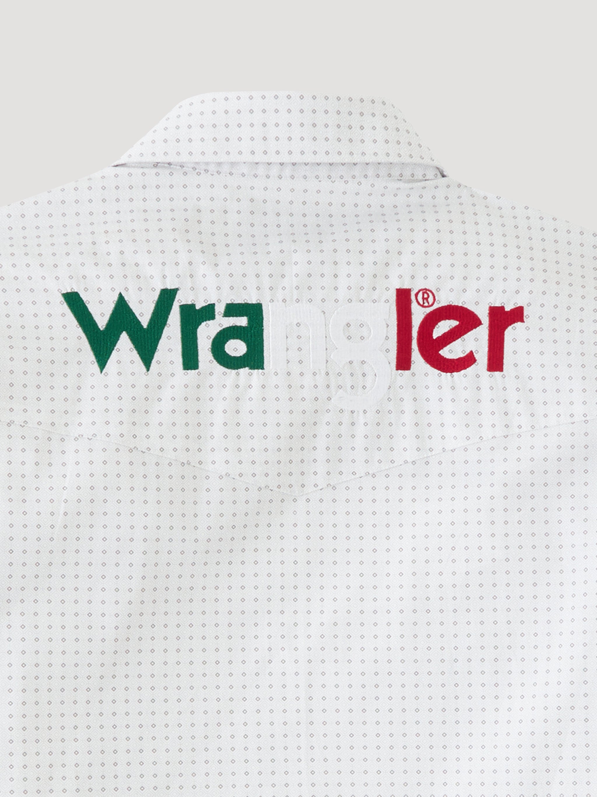 Iconic Branding: Features high-contrast Wrangler® logo embroidery on the collar, over the right chest pocket, and down the left sleeve.