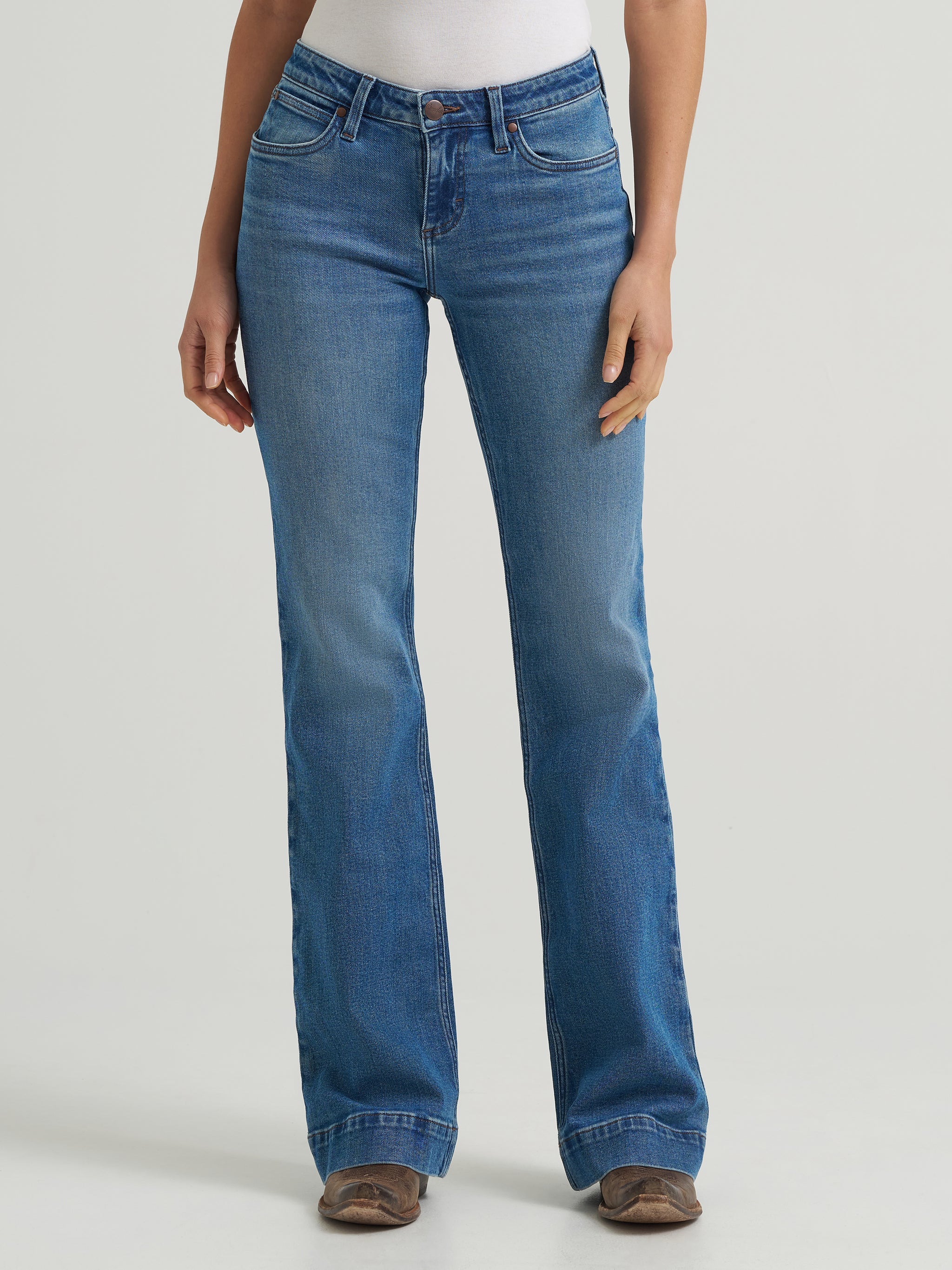 Like all Wrangler Retro® jeans, our Mae wide-leg trouser jean is marked by its Western authenticity, making it a go-to style for cowgirls everywhere. With its contour waist and mid-rise fit, these women's trouser jeans are made to fit comfortably while they flatter all your curves. With more room at the knee and a gradual opening down the leg, the Mae wide-leg trouser gives you the room you need to stay active and in style.